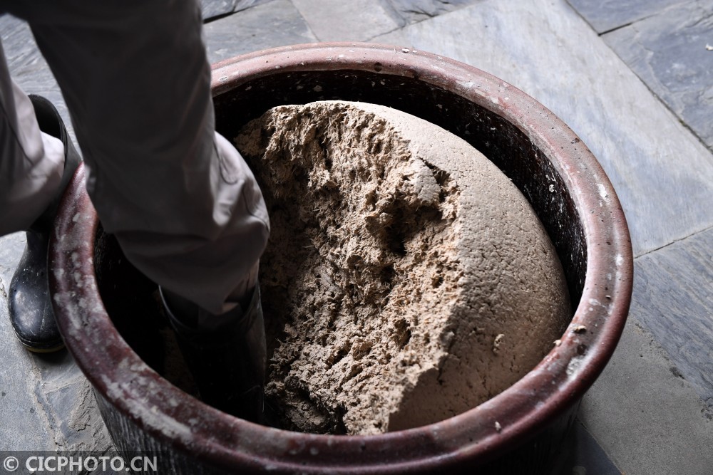 2020年5月30日,安徽泾县宣纸厂工人在进行踏料作业。CICPHOTO/张大岗 摄