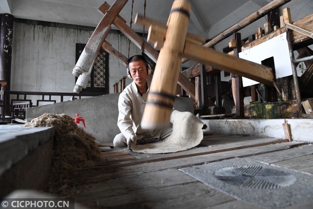 2020年5月30日,安徽泾县宣纸厂工人在进行碓皮作业。CICPHOTO/张大岗 摄