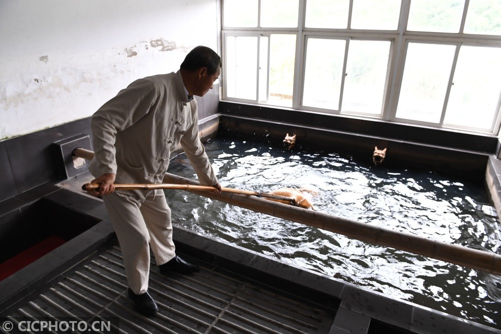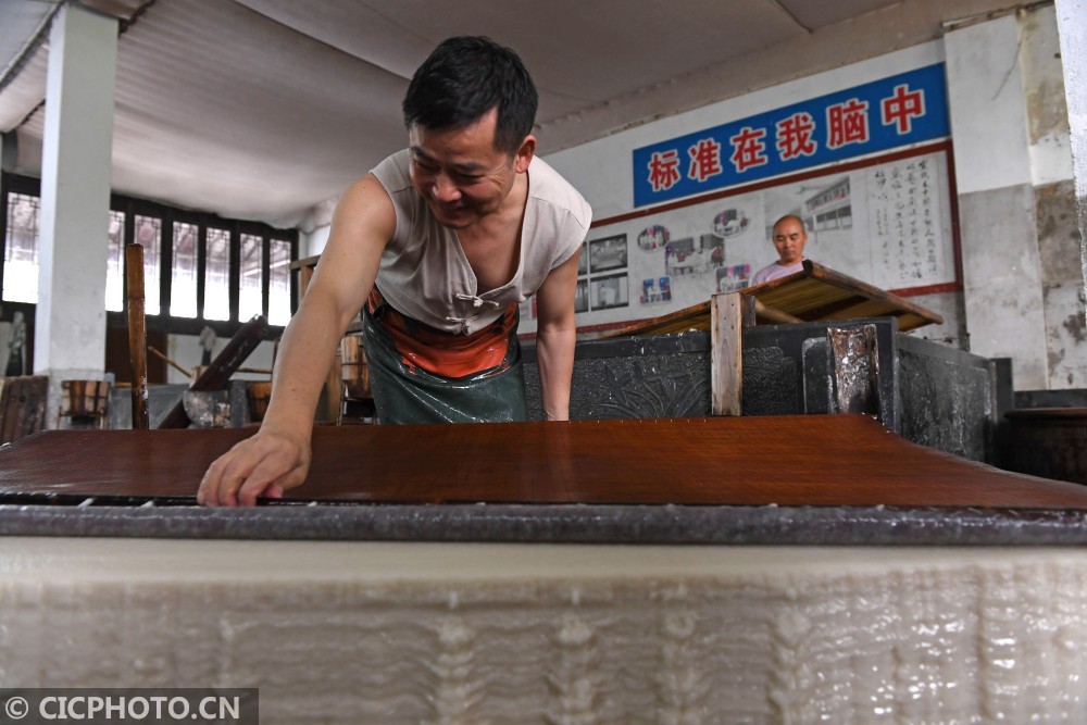 2020年5月30日,安徽泾县宣纸厂工人在进行捞纸作业。CICPHOTO/张大岗 摄