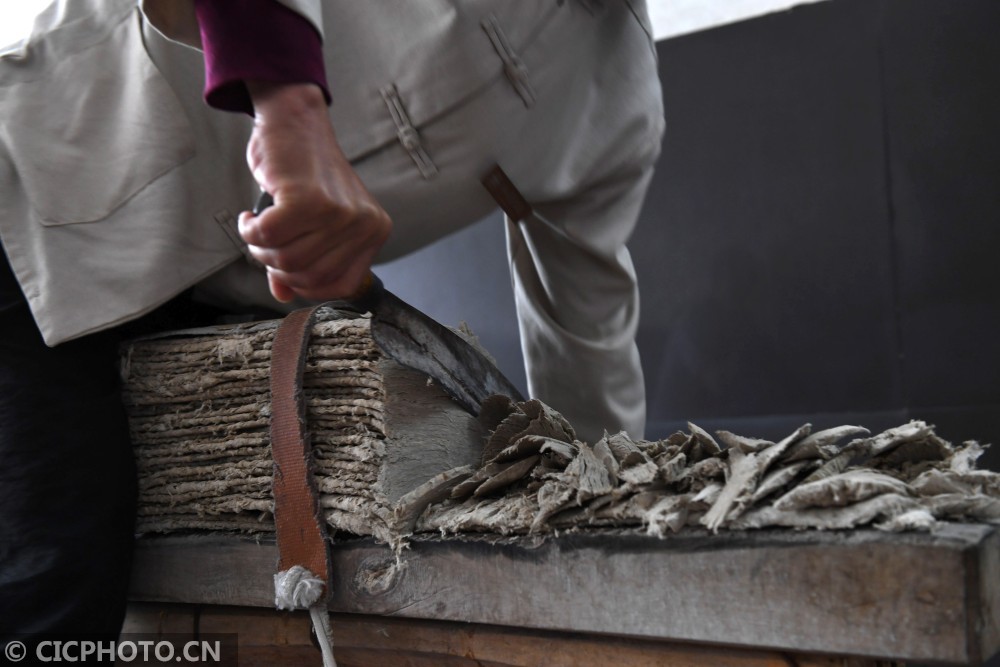 2020年5月30日,安徽泾县宣纸厂工人在进行切皮作业。CICPHOTO/张大岗 摄