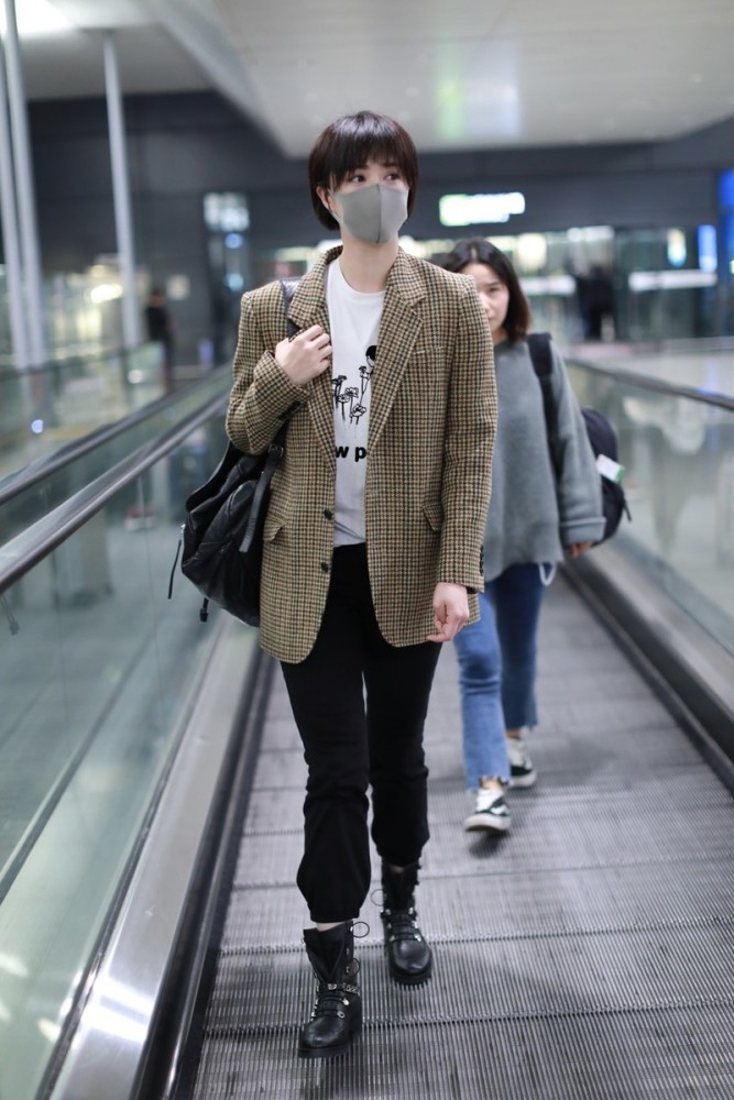 蒋欣还穿过宽肩格纹西装,整个造型就极具英伦风的气息与特点,穿搭时髦大气,而且非常减龄,宽肩西装显得比较宽松,可以遮挡住身材的缺点。蒋欣搭配了工装裤以及马丁靴,整个造型都显得很有个性,而且蒋欣的身材看起来特别棒,双腿又直又长,穿搭效果绝对满分