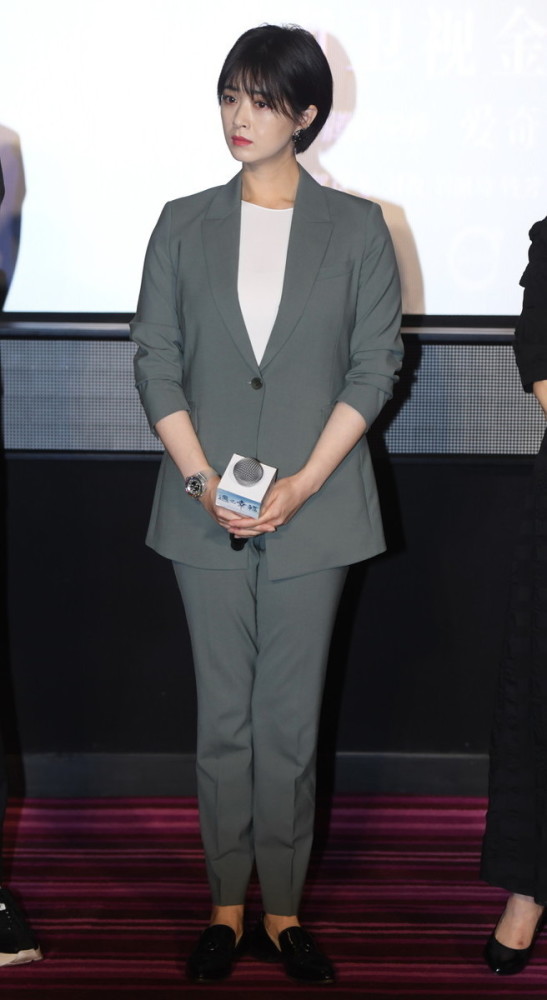 蒋欣还穿灰色西装套装,这件灰色西装并没有束缚身材,穿搭显得舒适宽松,里面搭配的白色T恤简约清爽,可以让穿搭变得更有气韵。西装裤的搭配具有很好的显瘦效果,整个造型也是非常舒适养眼的