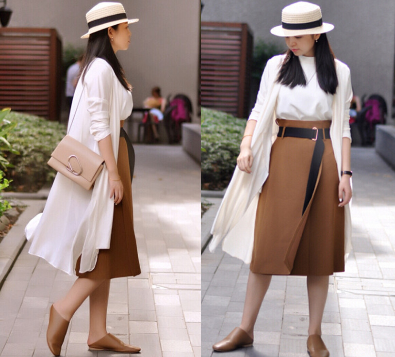 腰带的粗细会呈现出不同的风格来,身材偏胖或娇小,都不太适合宽大的腰带,会显得更加壮硕和累赘,上图右左边,三木的裙腰带宽度适中,和圆形手袋形成呼应的效果,显得气质超然,很有大女人的味道。