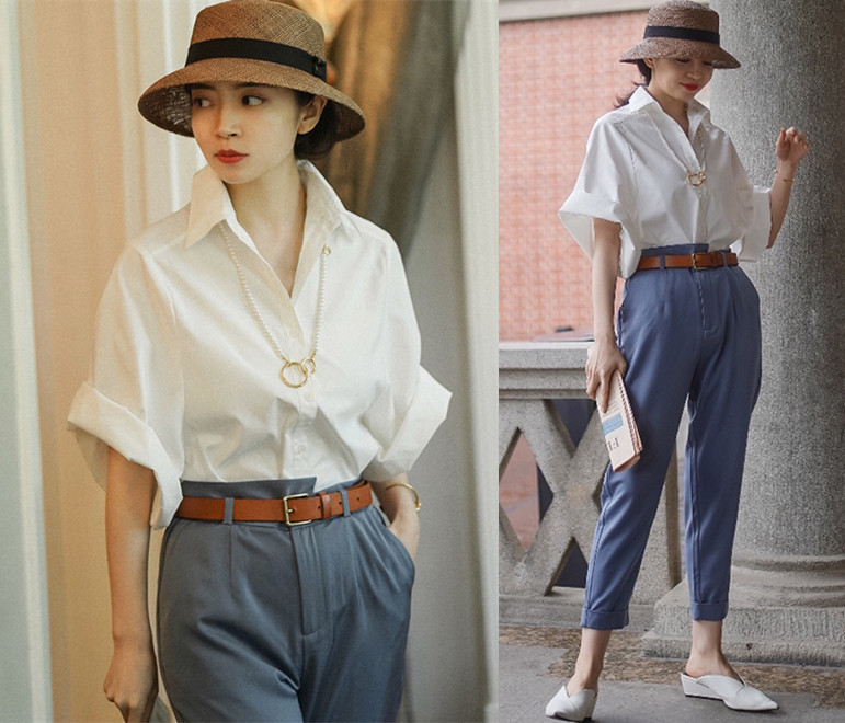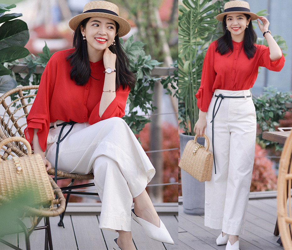 复古的西瓜红衬衫,搭配休闲宽松的白色纹直筒裤,从容自在,今年流行的西瓜红吸睛又高级,低调但很有品位,高级感满满的职场精英即视感。