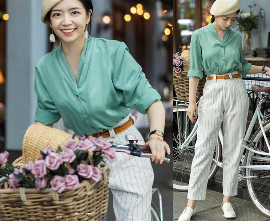 这款中等长度的基础款翠绿色衬衫,下身搭配一条较为合身的条纹九分裤,再配上一双白色休闲鞋,使用到的单品都是很简单的设计,休闲中透露出些许干练。