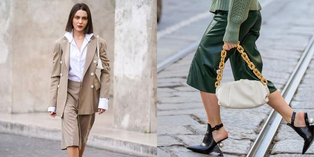 大方的暖调造型会让你整体气质看上去更加柔和,这时候可以选择冷调的鞋子来增加整体造型的对比。