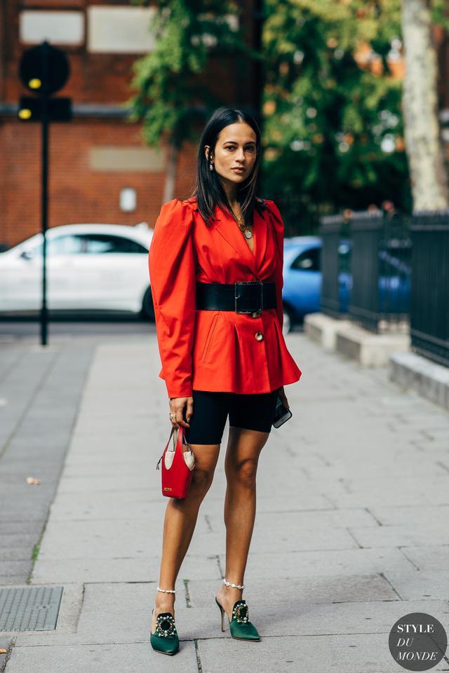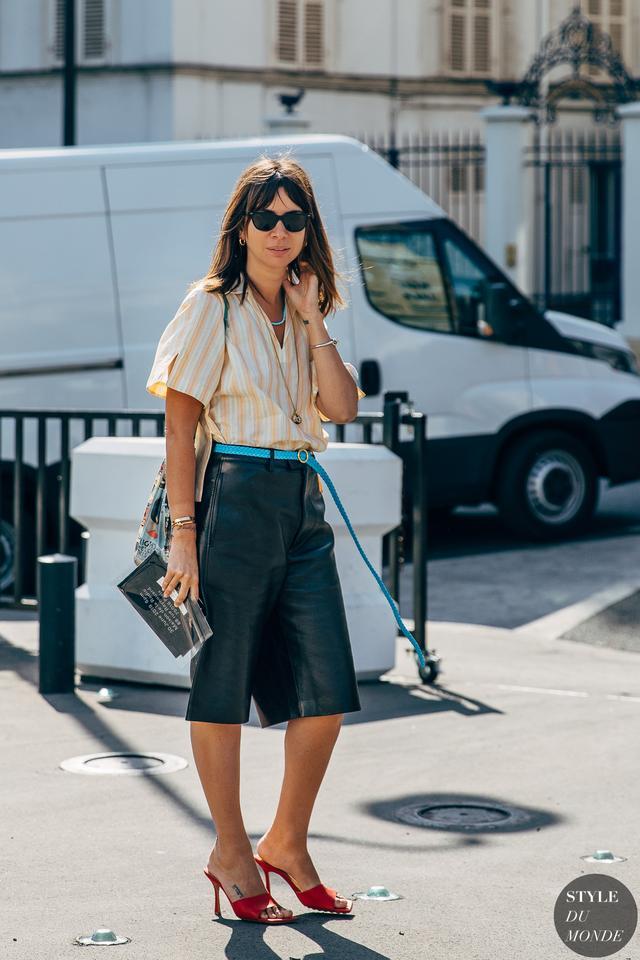 还有一种五分裤的穿法就是放在皮革套装里,造型不仅清凉还显得格外地飒爽帅气。