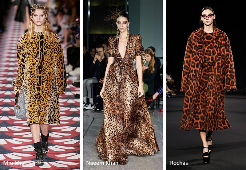 范思哲(Versace)的豹纹服装格外招摇,超模Kaia Gerber穿着印有豹纹图案的厚重裘皮大衣,搭配同样印有虎纹图案的亮闪闪的迷你裙。我们还在Miu Miu和Rochas看到了几件豹纹大衣。