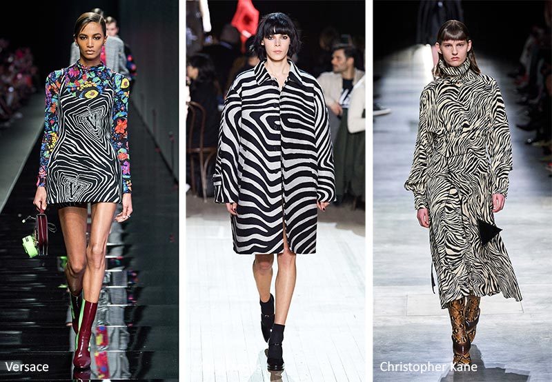 秀场上,克里斯托弗·凯恩(Christopher Kane)的印花包罗万象,用斑马纹面料做了一件长袖高领连衣裙和一条长裙。