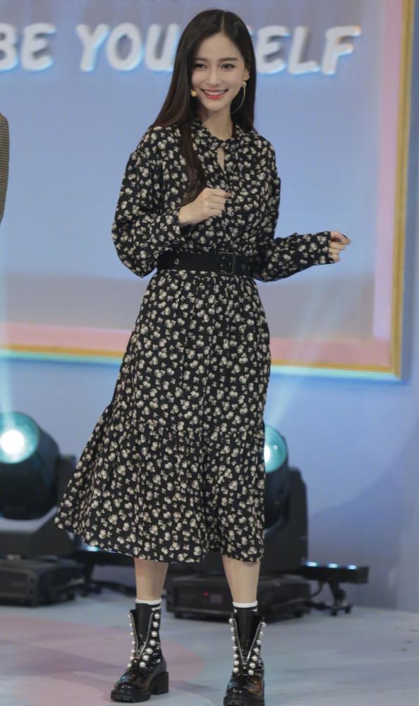 还有一点就是鞋子的搭配,她没有为了搭配裙子选择淑女风的鞋子,而是搭配了一双皮质马丁靴和条纹袜子,增添了亮点,也让整个人看起来更加的个性。整身的单品颜色都比较暗,但亮色手镯还有鞋上的大颗珍珠都让全身穿搭显得不那么单调。所以如果也想要挑战碎花长裙,可以学习下Angelababy的这一身穿搭细节。