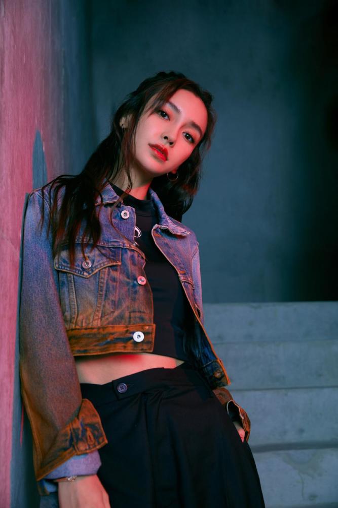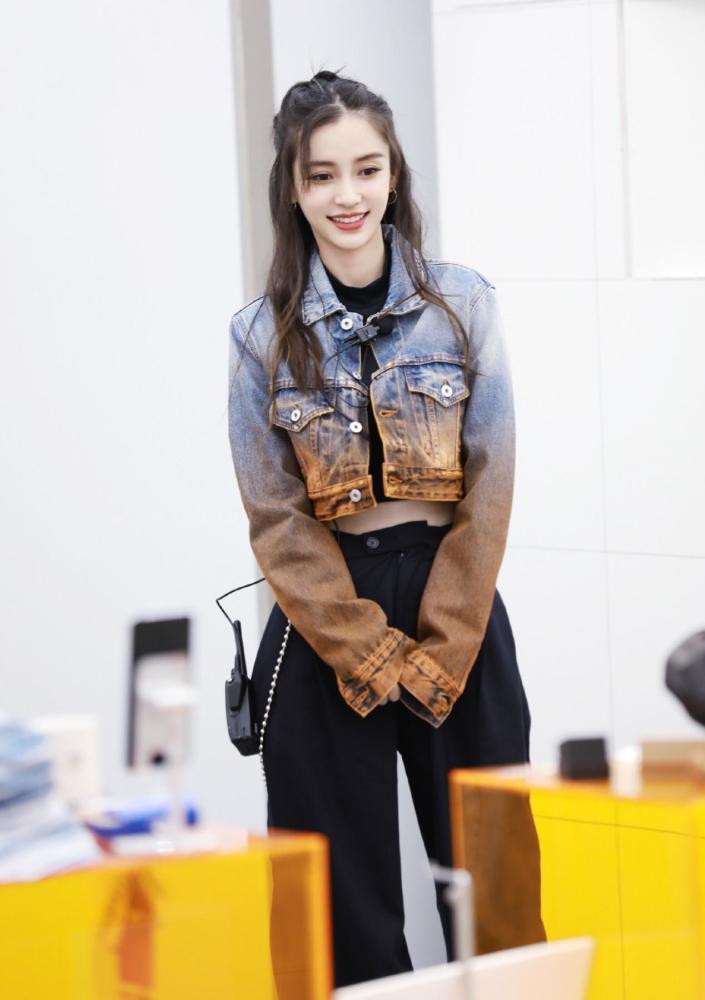 连衣裙是比较淑女又有个性的风格,第二套穿搭就比较酷炫了。牛仔是永远不会过时的一个元素,而baby的这件牛仔外套有两个特点,一个就是颜色,渐变色外套时尚又有特色。还有一个就是短款的设计,搭配里面的短款打底,很好的把她的小蛮腰显露出来了。