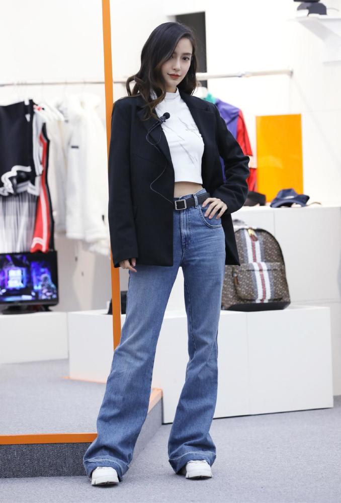 第三套乍看与第二套的搭配有点相似,都是短上衣搭配长裤再加一件外套,但两套的风格却完全不一样。如果说上一身的Baby是酷女孩,这一身就多了一份干练和帅气。选用了西装外套与休闲的牛仔喇叭裤进行混搭,不仅没有显得很怪异,反而是完美的融合在一起。牛仔喇叭裤复古时尚,配上短T恤,瞬间把人的比例都拉长了。而且喇叭裤上面较窄,显得人很瘦,下方宽松设计又可以很好修饰腿型。如果对自己的下半身曲线有所困扰,可以尝试搭配这种裤子,是一个很不错的选择。