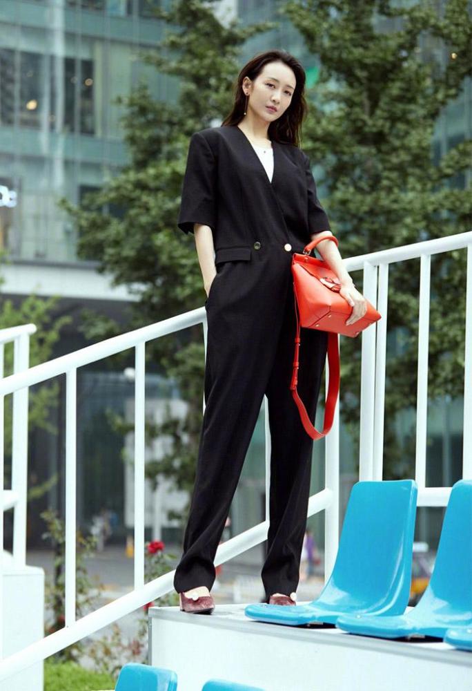 由于连体裤的版型自成一体,并没有明显的分割线来突出上下半身的比例,很容易模糊腰线,稍微出错就会显矮显胖,所以在选择连体裤时尽量选择收腰款式,或者挑选一条合适的腰带搭配。王鸥身穿的这一款连体裤就采用了收腰设计,凸显纤细腰肢的同时完善身材比例,利落感十足。