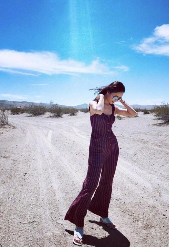 如果担心纯色连体裤过于单调,也可以选择更能凸显造型的条纹连体裤。条纹元素基本每年都活跃在时尚圈中,看似简单的线条却赋予了服饰更多的时髦感,既简约又不单调。王鸥身穿的这条连体裤就运用了条纹元素加持,撞色设计提高了造型的吸睛指数,简单搭配墨镜更是街头感满满。