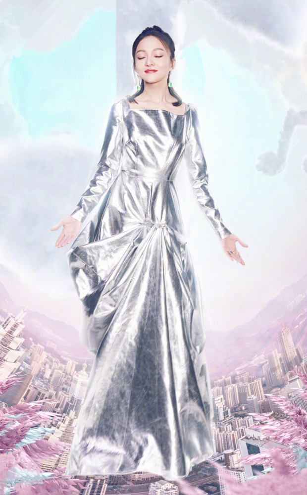 张韶涵身上这款银色连衣裙,它因为看上去闪闪发光的面料,所以就显得她整个人十分的抢眼;裙子当中的一字肩设计,也是能够突显出她精致的锁骨,再加上裙子全身因为都是银色的面料,所以就让张韶涵的这个造型显得很未来感。